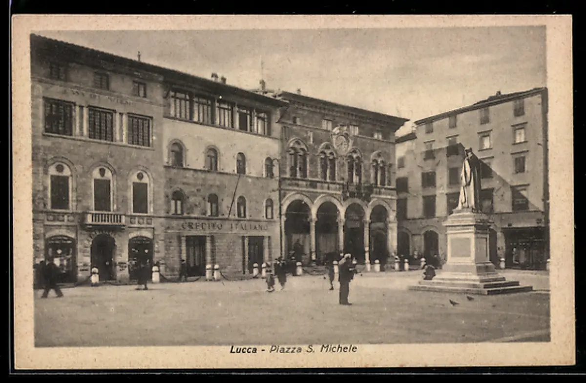 AK Lucca, Piazza S. Michele con statua e edifici storici