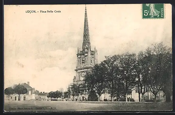 AK Lucon, Place Belle-Croix et l`église majestueuse entourée d`arbres