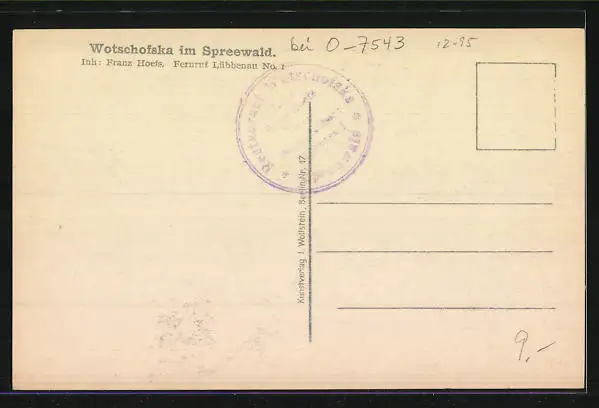 Personenbezogene Daten auf der Rückseite der Karte wurden durch blauen Textmarker unkenntlich gemacht. Die blauen Stellen sind auf die Vorderseite durchgeweicht und wirken sich negativ auf das Postkartenfoto aus