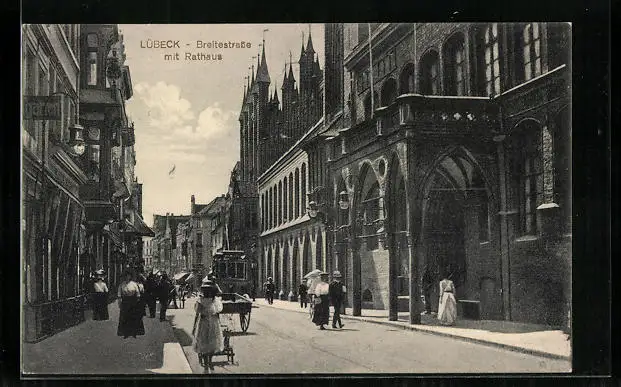 AK Lübeck, Breitestrasse mit Rathaus, Strassenbahn