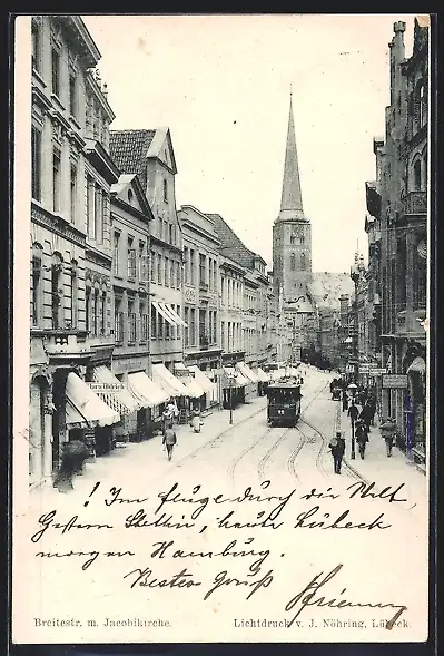 AK Lübeck, Strassenbahn in der Breitestrasse mit Jacobikirche