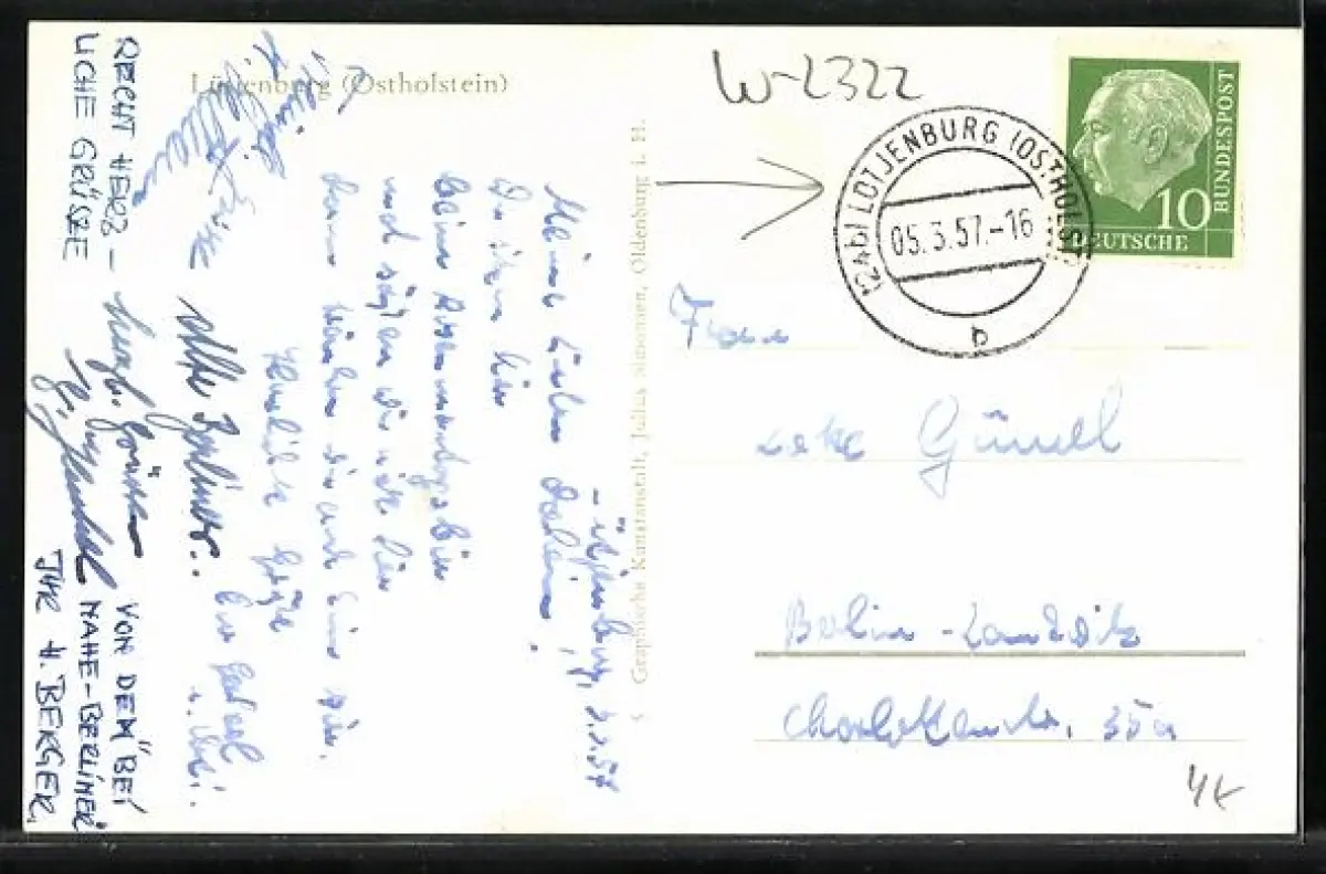 Personenbezogene Daten auf der Rückseite der Karte wurden durch blauen Textmarker unkenntlich gemacht. Die blauen Stellen sind auf die Vorderseite durchgeweicht und wirken sich negativ auf das Postkartenfoto aus