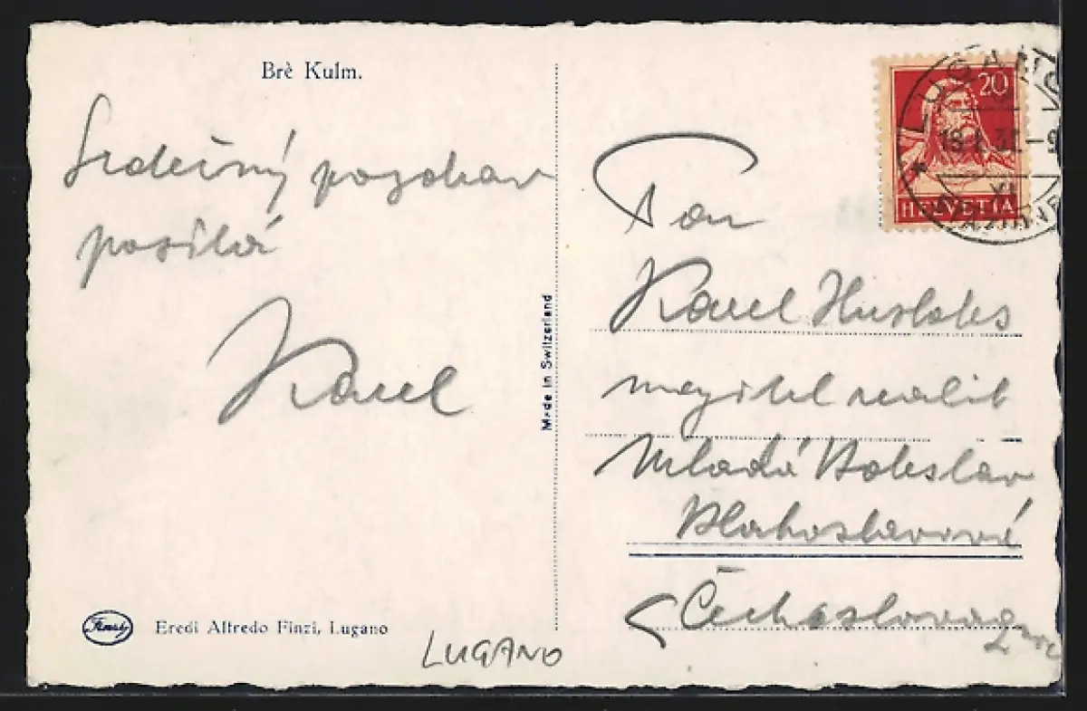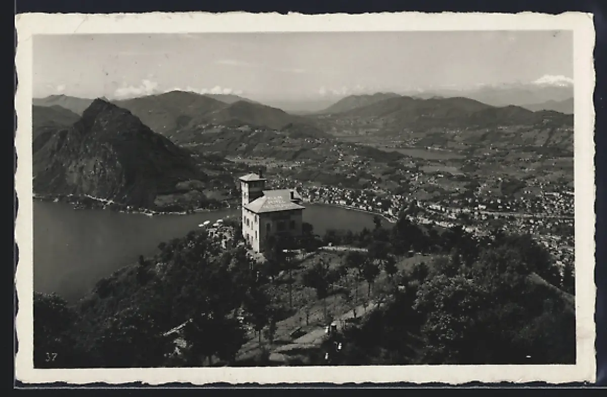 AK Lugano, Brè Kulm und Stadt aus der Vogelschau