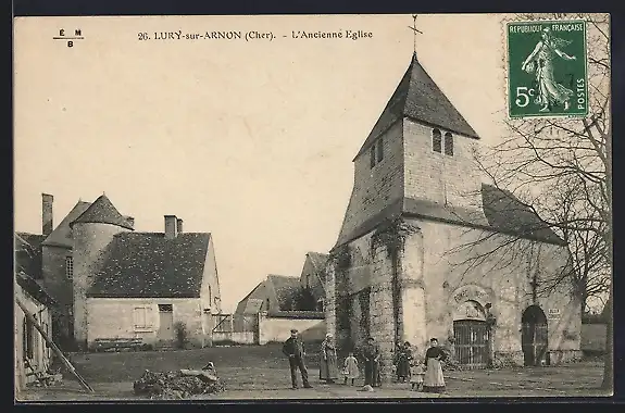 AK Lury-sur-Arnon, L`ancienne église et habitants devant le bâtiment