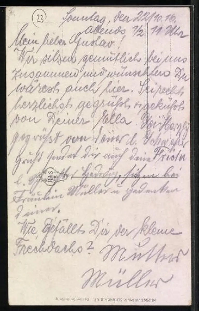 Personenbezogene Daten auf der Rückseite der Karte wurden durch blauen Textmarker unkenntlich gemacht. Die blauen Stellen sind auf die Vorderseite durchgeweicht und wirken sich negativ auf das Postkartenfoto aus