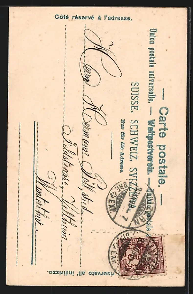 Personenbezogene Daten auf der Rückseite der Karte wurden durch blauen Textmarker unkenntlich gemacht. Die blauen Stellen sind auf die Vorderseite durchgeweicht und wirken sich negativ auf das Postkartenfoto aus