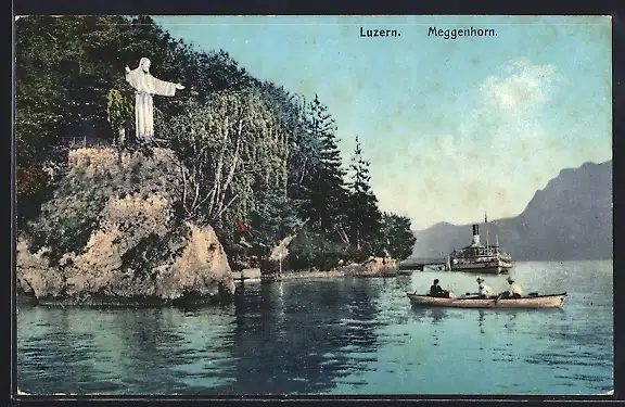 AK Luzern, Meggenhorn, Seepartie mit Christus-Statue, Boot u. Dampfer