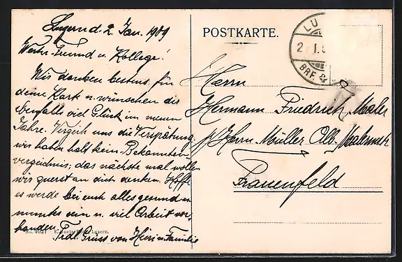 alte Ansichtskarte, gelaufen 1909, Briefmarke entfernt, rückseitig Oberflächenschaden, guter Zustand