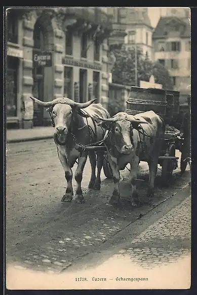 AK Luzern, Ochsengespann zieht Fässer durch die Stadt
