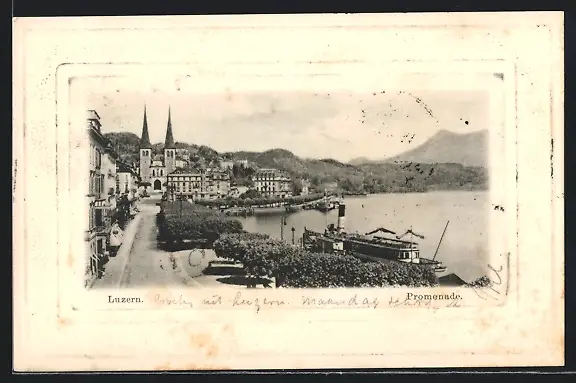 AK Luzern, Promenade, Dampfer am Anleger, Blick zur Kirche
