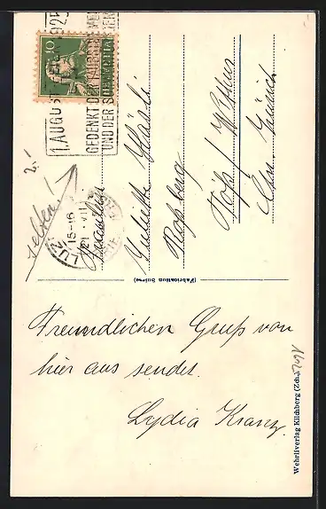 Personenbezogene Daten auf der Rückseite der Karte wurden durch blauen Textmarker unkenntlich gemacht. Die blauen Stellen sind auf die Vorderseite durchgeweicht und wirken sich negativ auf das Postkartenfoto aus