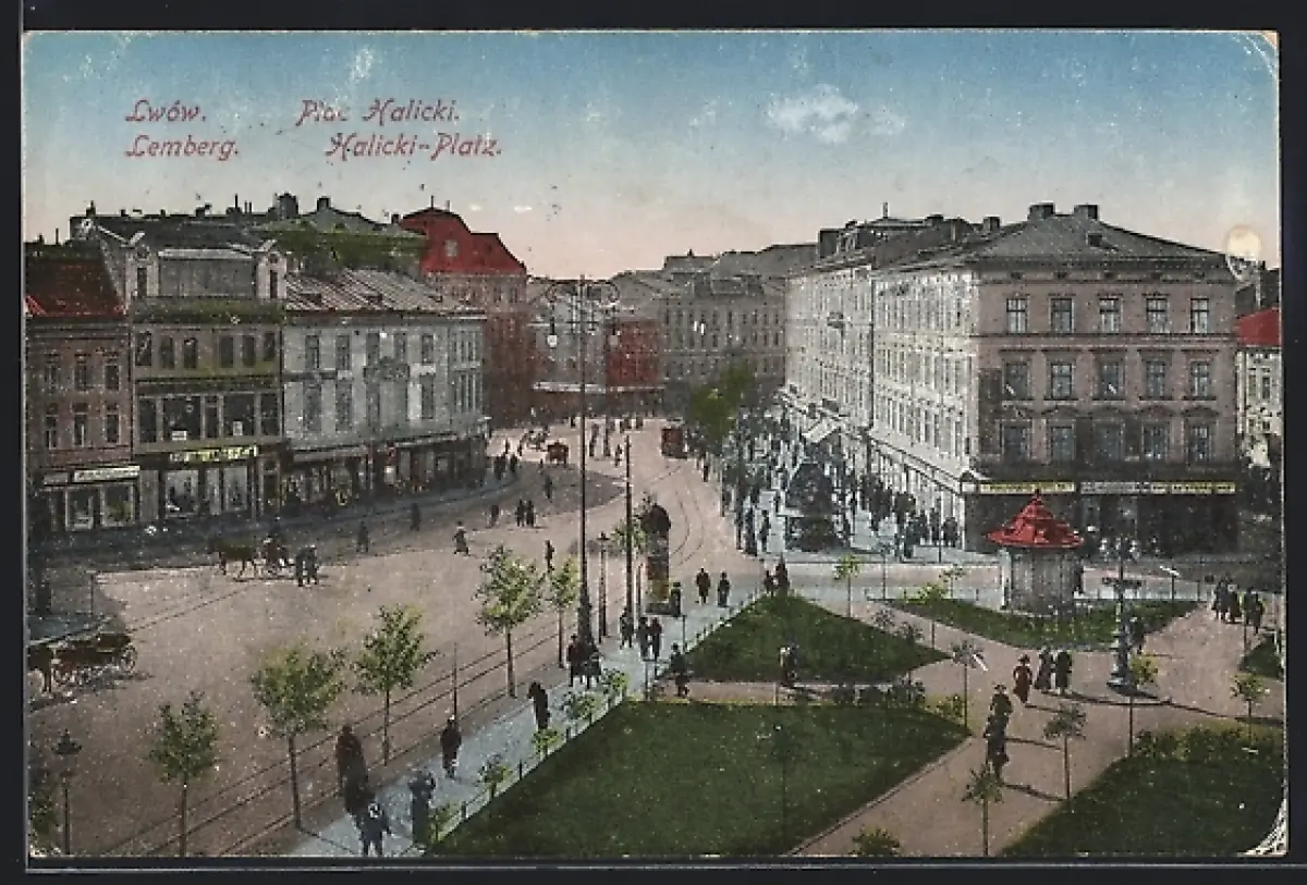 AK Lwow / Lemberg, Plac Halicki, Haliczer-Platz mit Litfasssäule