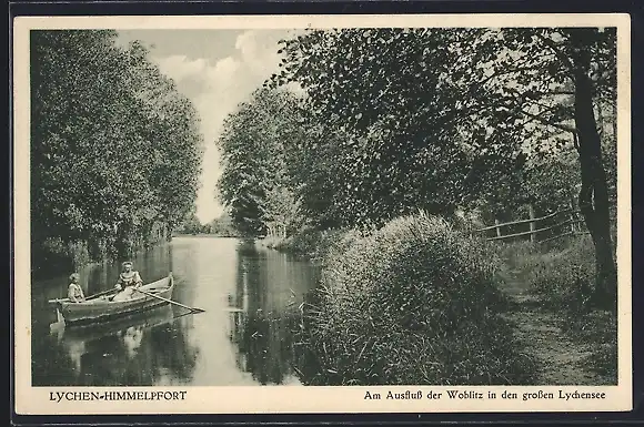 AK Lychen-Himmelpfort, Am Ausfluss der Woblitz in den grossen Lychensee mit kleinem Paddelboot