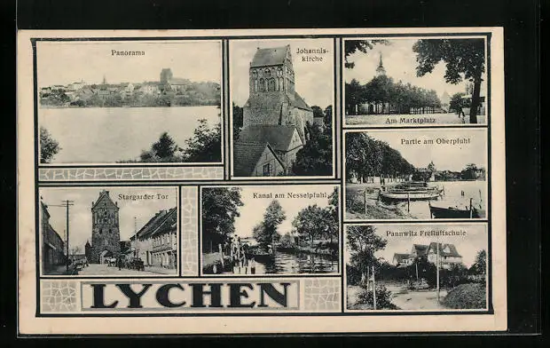 AK Lychen, Panoramaansicht mit Johanniskirche und Partie am Oberpfuhl