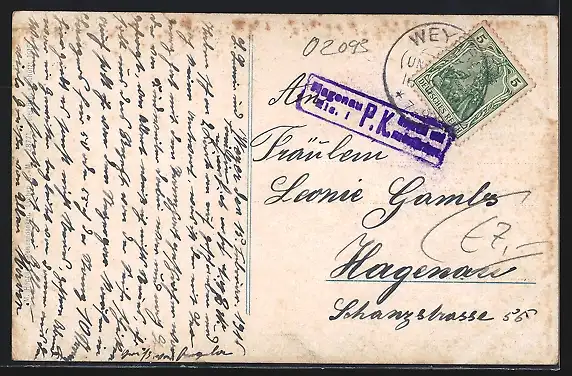 Personenbezogene Daten auf der Rückseite der Karte wurden durch blauen Textmarker unkenntlich gemacht. Die blauen Stellen sind auf die Vorderseite durchgeweicht und wirken sich negativ auf das Postkartenfoto aus