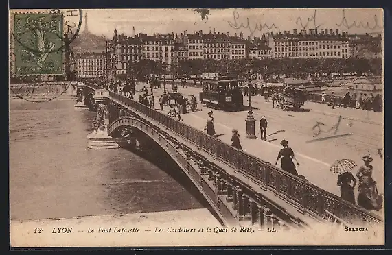AK Lyon, le pont Lafayette, les cordeliers et le quai de Retz, Strassenbahn
