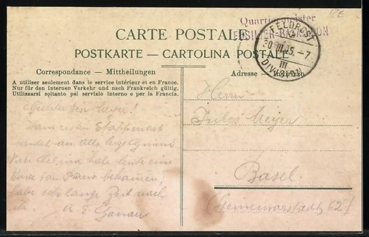Personenbezogene Daten auf der Rückseite der Karte wurden durch blauen Textmarker unkenntlich gemacht. Die blauen Stellen sind auf die Vorderseite durchgeweicht und wirken sich negativ auf das Postkartenfoto aus