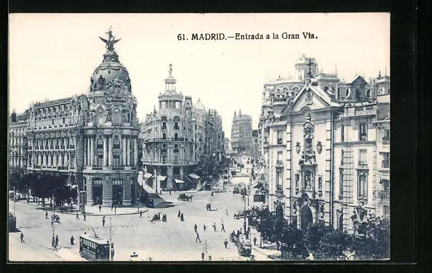 AK Madrid, Entrada a la Gran Via, Strassenbahn unterwegs