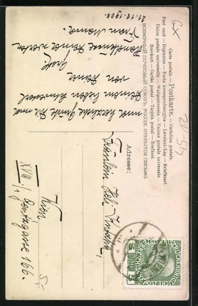 Personenbezogene Daten auf der Rückseite der Karte wurden durch blauen Textmarker unkenntlich gemacht. Die blauen Stellen sind auf die Vorderseite durchgeweicht und wirken sich negativ auf das Postkartenfoto aus