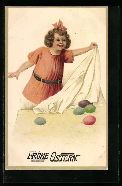 AK Mädchen entdeckt zu Ostern bunte Eier unter der Decke