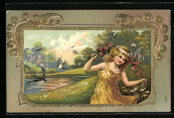 AK Mädchen mit Blumen tanzt auf einer Wiese