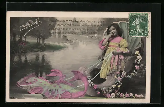 AK Mädchen mit Fischen zum 1. April