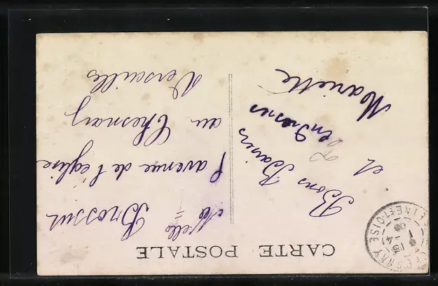 Personenbezogene Daten auf der Rückseite der Karte wurden durch blauen Textmarker unkenntlich gemacht. Die blauen Stellen sind auf die Vorderseite durchgeweicht und wirken sich negativ auf das Postkartenfoto aus