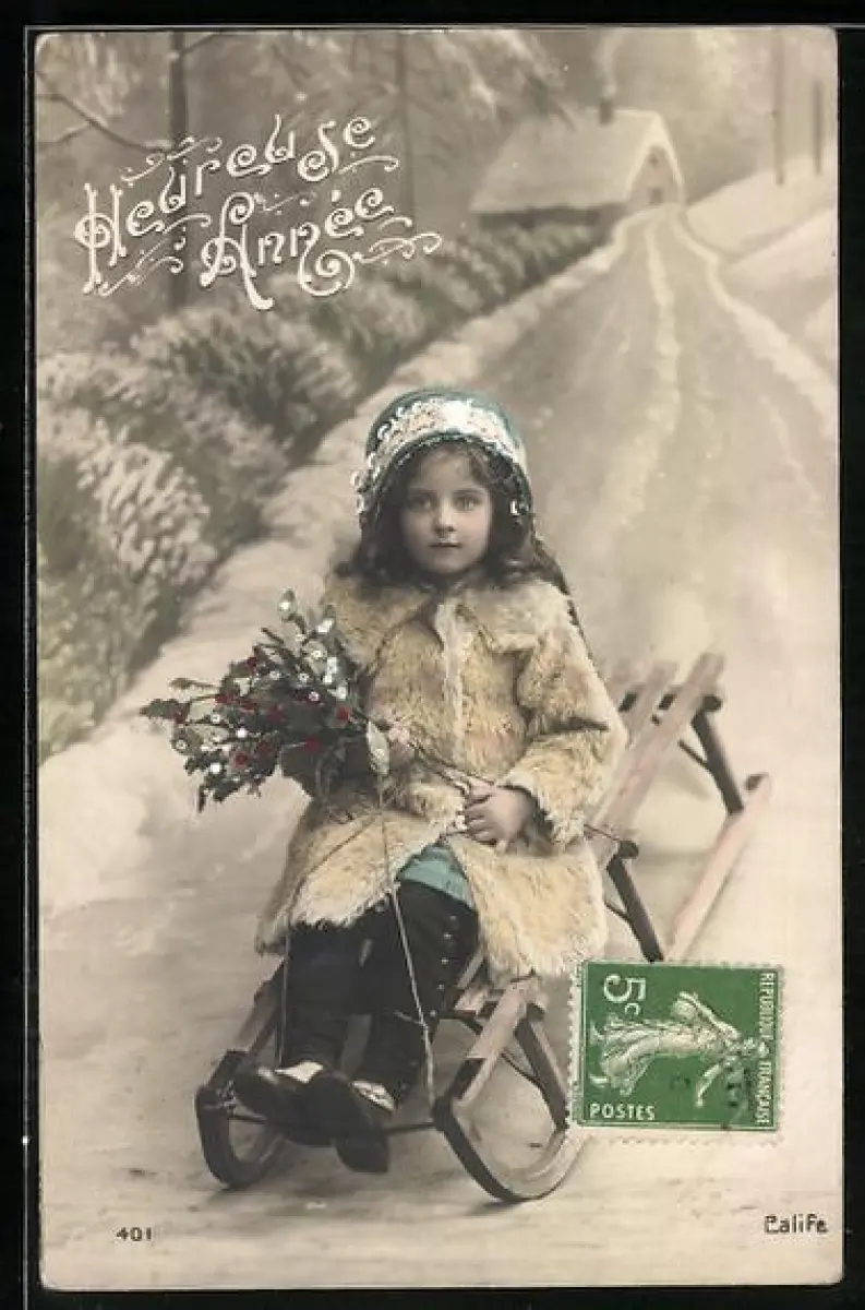 AK Mädchen mit Mistelzweig auf einem Schlitten