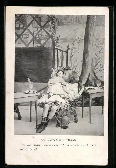 AK Mädchen mit einer Puppe im Sessel sitzend