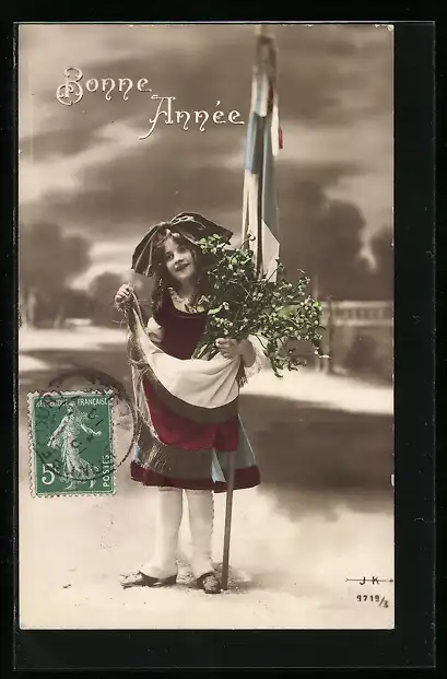AK Mädchen mit französischer Fahne und Mistelzweig