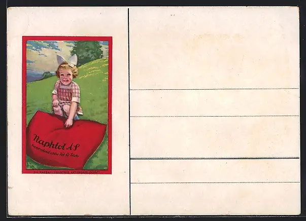 AK Mädchen mit roter Decke auf einer Wiese, Farbe Naphtol / Rot für Inletts der IG Farbenidustrie AG
