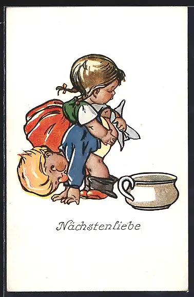 AK Mädchen reinigt den Po eines Knaben nach der Verrichtung des Geschäfts