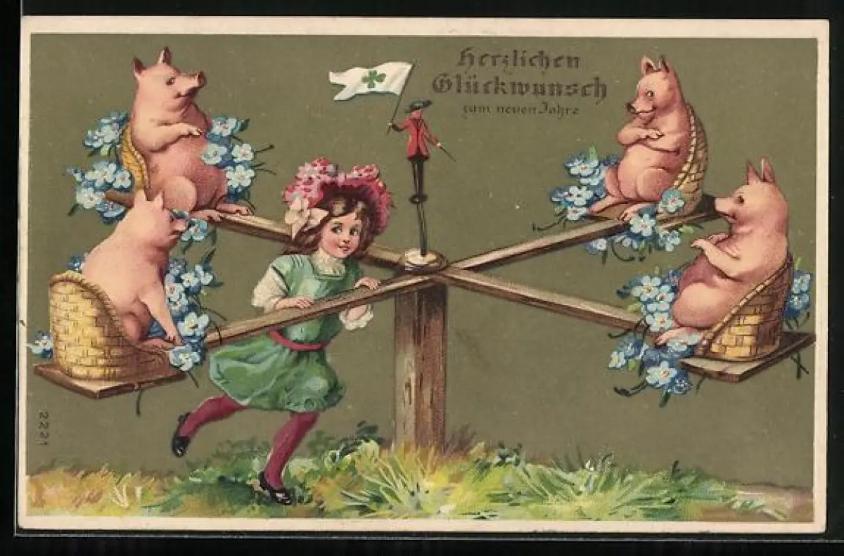 AK Mädchen schiebt ein Karussell mit vergnügten Schweinen und Vergissmeinnicht, Neujahrsgruss