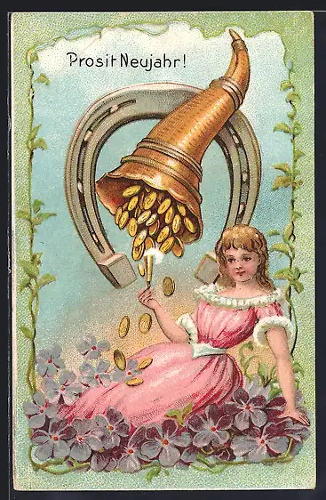 AK Mädchen sitzt in Vergissmeinnicht, aus Kelch fällt Geld auf sie herab