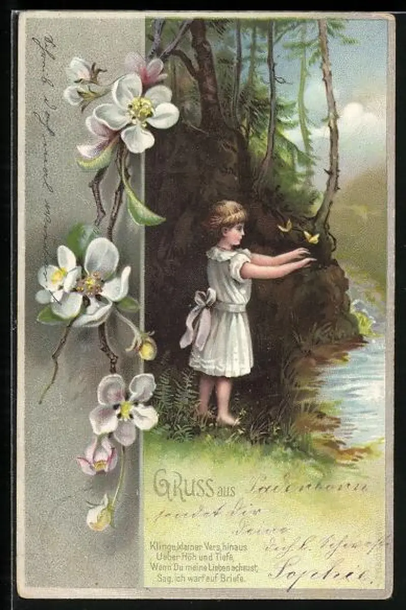 AK Mädchen spielt mit Schmetterlingen an Uferpartie