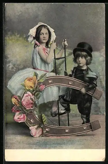 AK Mädchen und Schornsteinfeger stehen hinter einem riesigen Hufeisen