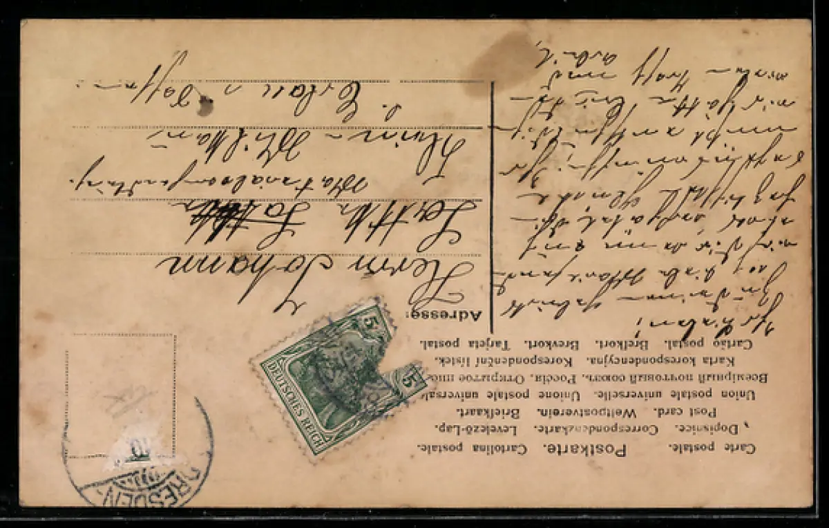 alte Ansichtskarte, gelaufen, Briefmarke entfernt, vorderseitig Klebe- und Papierreste, Abriebspur re. oben, guter Zustand