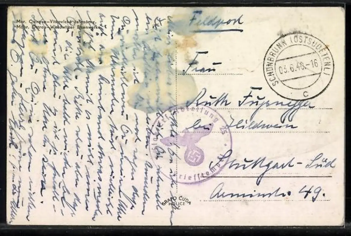 Personenbezogene Daten auf der Rückseite der Karte wurden durch blauen Textmarker unkenntlich gemacht. Die blauen Stellen sind auf die Vorderseite durchgeweicht und wirken sich negativ auf das Postkartenfoto aus