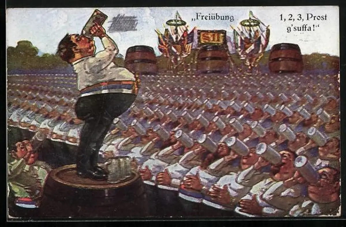 AK Männer in Reih und Glied bei einer Freiübung im Biertrinken