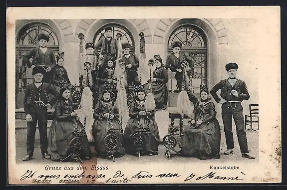 AK Männer und Frauen in elsass-lothringischer Tracht in einer Kunkelstube