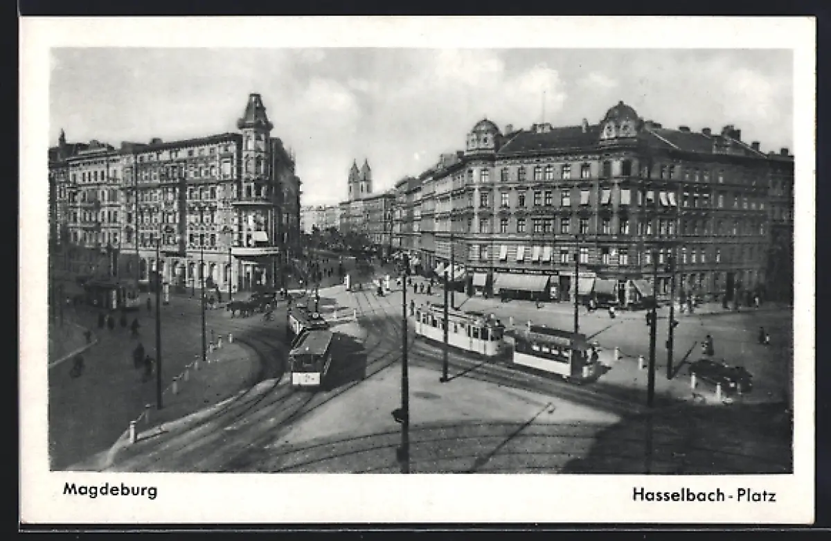 AK Magdeburg, Hasselbach-Platz, Strassenbahn vor Wohn- und Geschäftshäusern