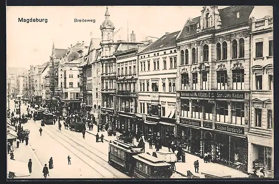 AK Magdeburg, Strasse Breiteweg mit Geschäften und Strassenbahn