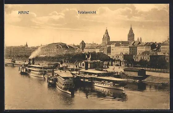 AK Mainz, Dampfer auf dem Rhein, Blick auf die Stadt