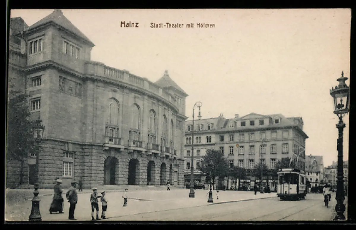 AK Mainz, Stadt-Theater mit Höfchen, Strassenbahn