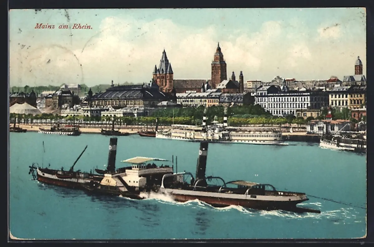 AK Mainz am Rhein, Raddampfer fährt an der Stadt vorbei