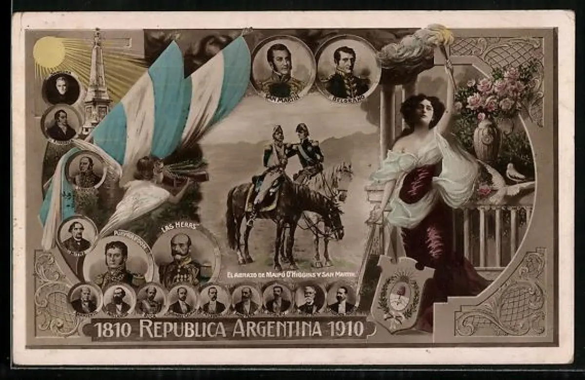 AK Maipu, Republica Argentina 1810-1910, El Abrazo de Maipu O`Higgins y San Martin, Portraits, Fahne, Wappen
