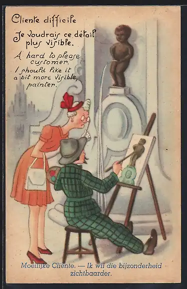 AK Maler malt einen Brunnen, älter Dame begutachtet das Bild, Toilettenhumor