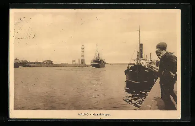 AK Malmö, Hamninloppet, Hafenpartie mit Leuchtturm