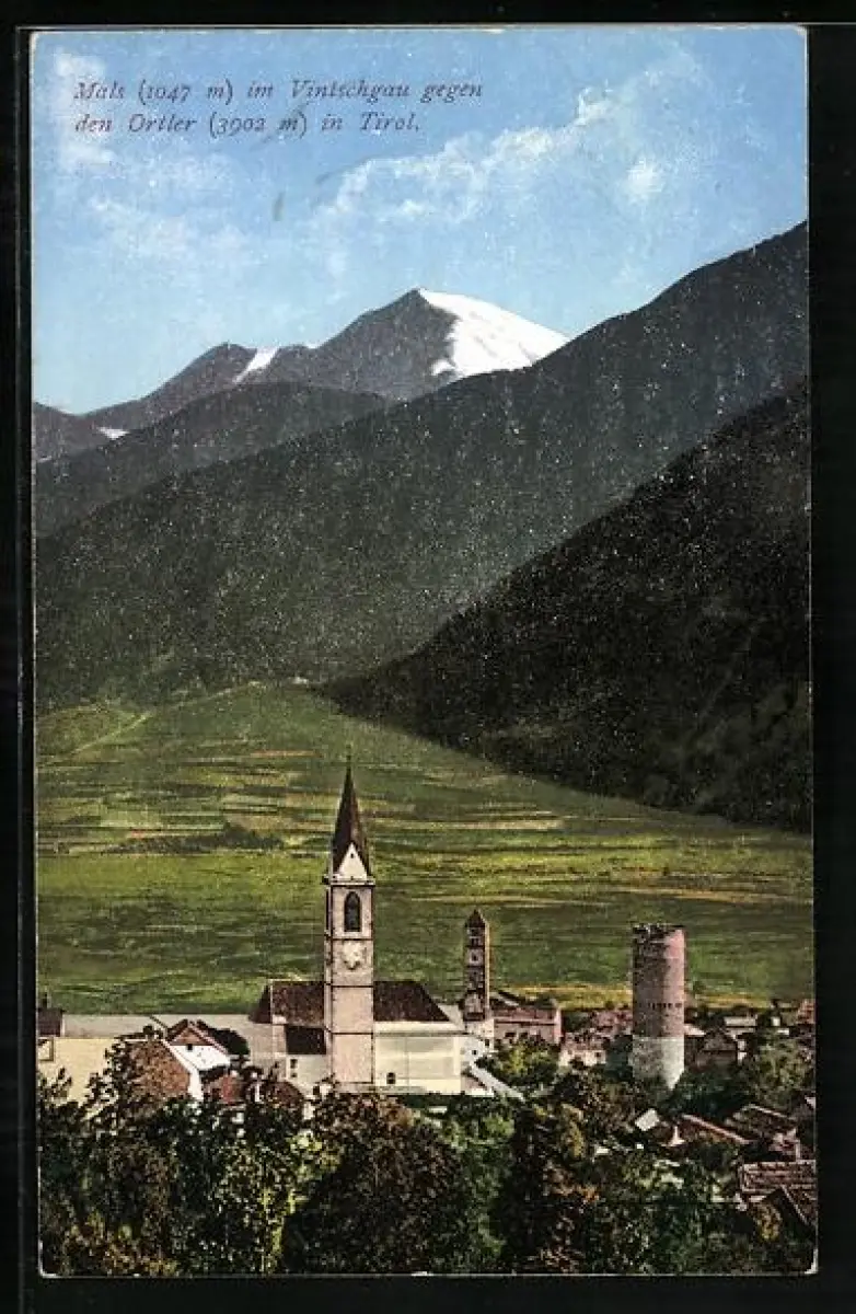 AK Mals, Ortsansicht mit Kirche