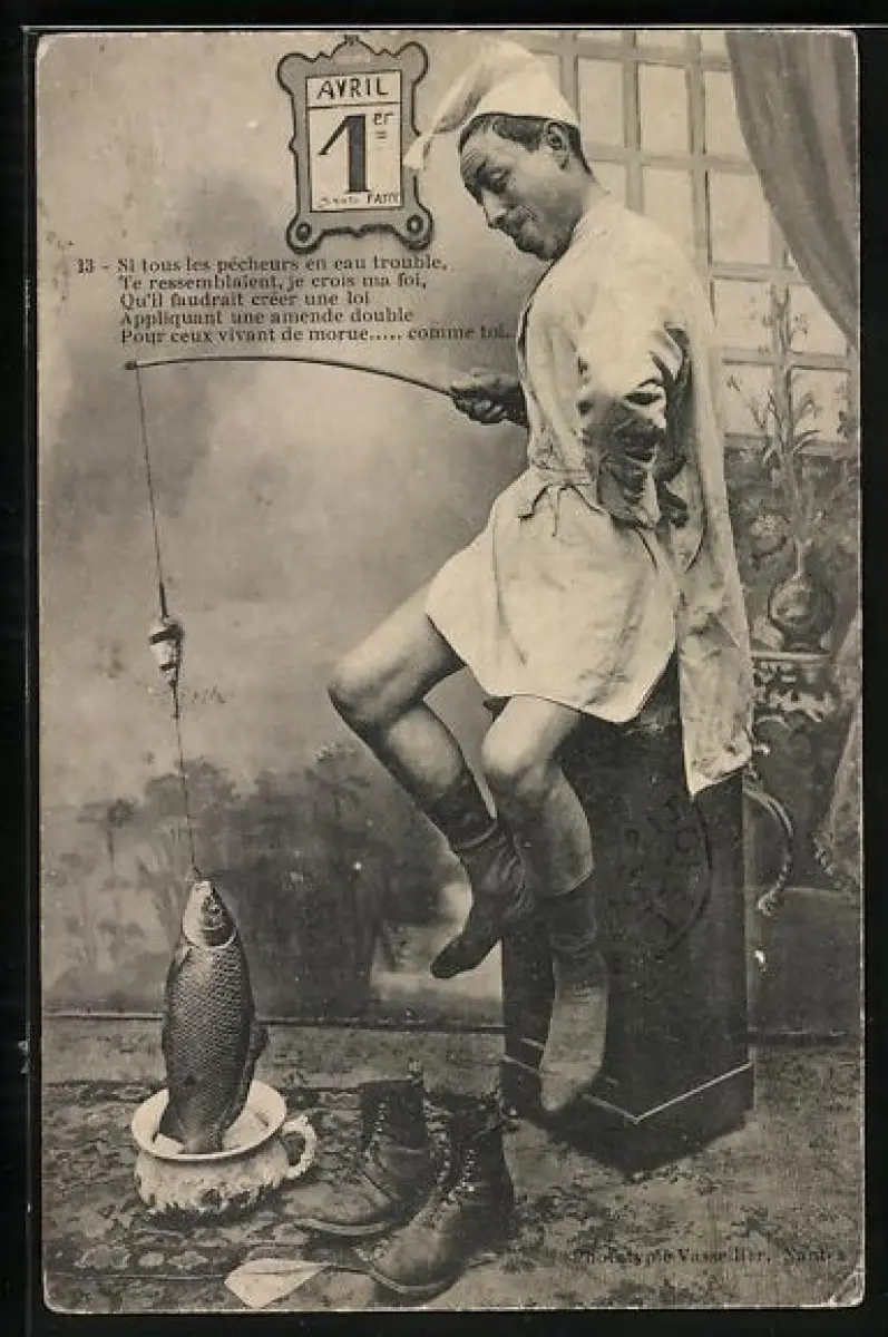 AK Mann angelt in einem Nachttopf und zieht einen Fisch heraus, 1. April, 1er Avril